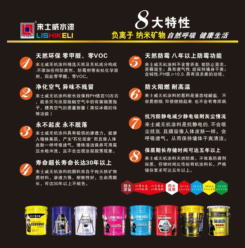 來士威無機納米礦物涂料采用天然無機礦物質量,沒有添加任何化學成分和人工合成部分,釋放健康離子(負氧離子)原理技術源于天然,無需外部能源催化,在不開燈的情況下釋放負氧離子24小時持續凈化甲醛,與市面上其它墻面材料利用光觸媒進行凈化甲醛有著本質上的區別,從而凈化空氣。